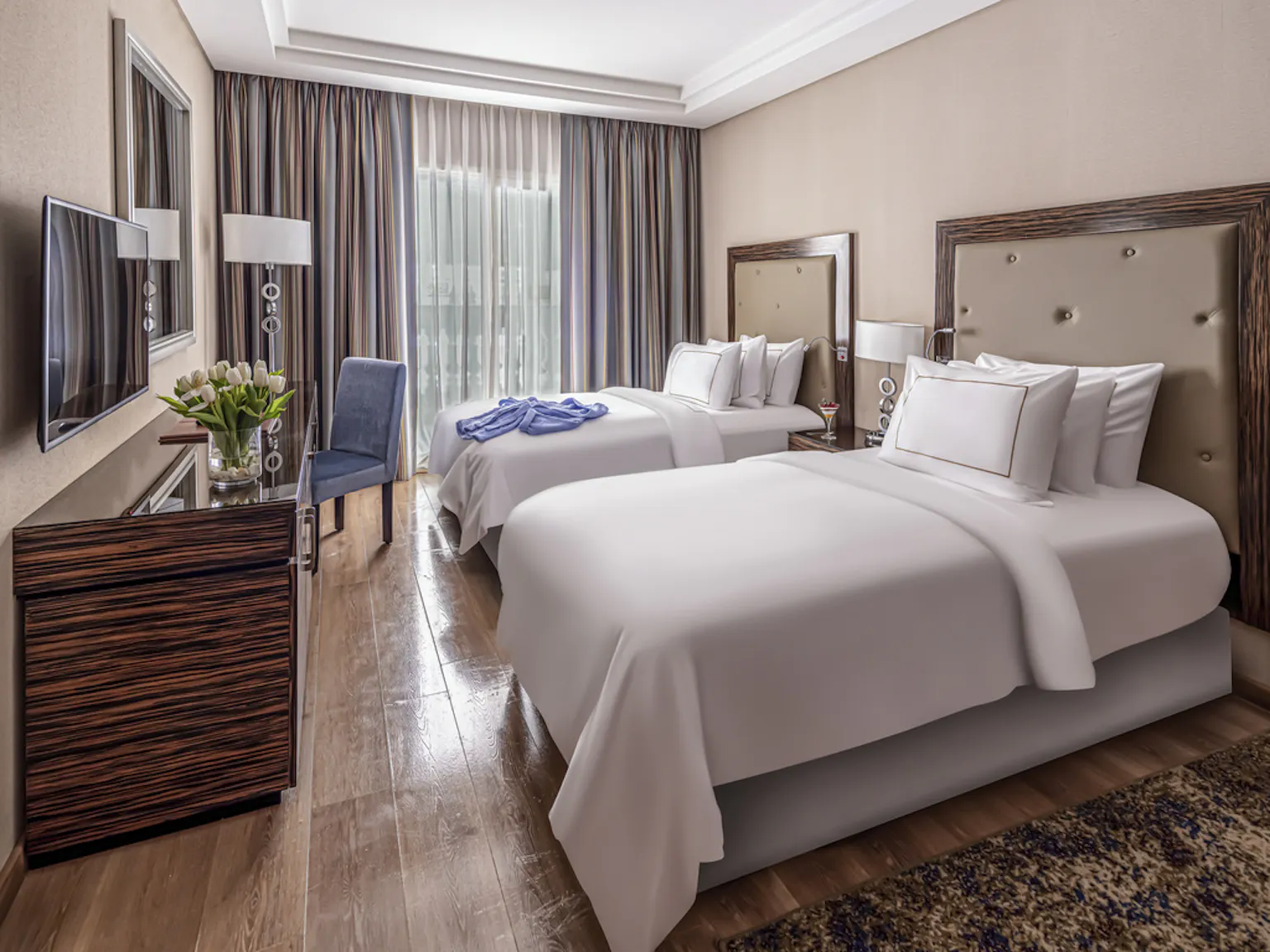 • 1 fully stocked mini-bar, tea and coffee making facilities, bathrobes and slippers, 3 LCD IPTV screens, 2 bathrooms, 2 safe boxes, terrace